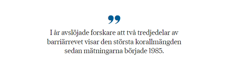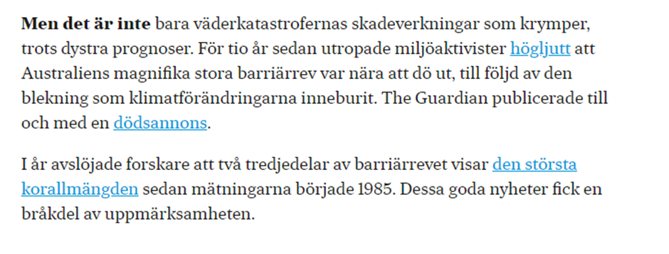Det framgår likaså i den inledande sammanfattningen att Lomborg ljuger rakt av, de påstår inte vad Lomborg säger (om de nu hade varit ”miljöaktivister”). SvD väljer att slå upp i stora bokstäver hur forskare nu ”avslöjade” uppgifter om koralltäckningen.